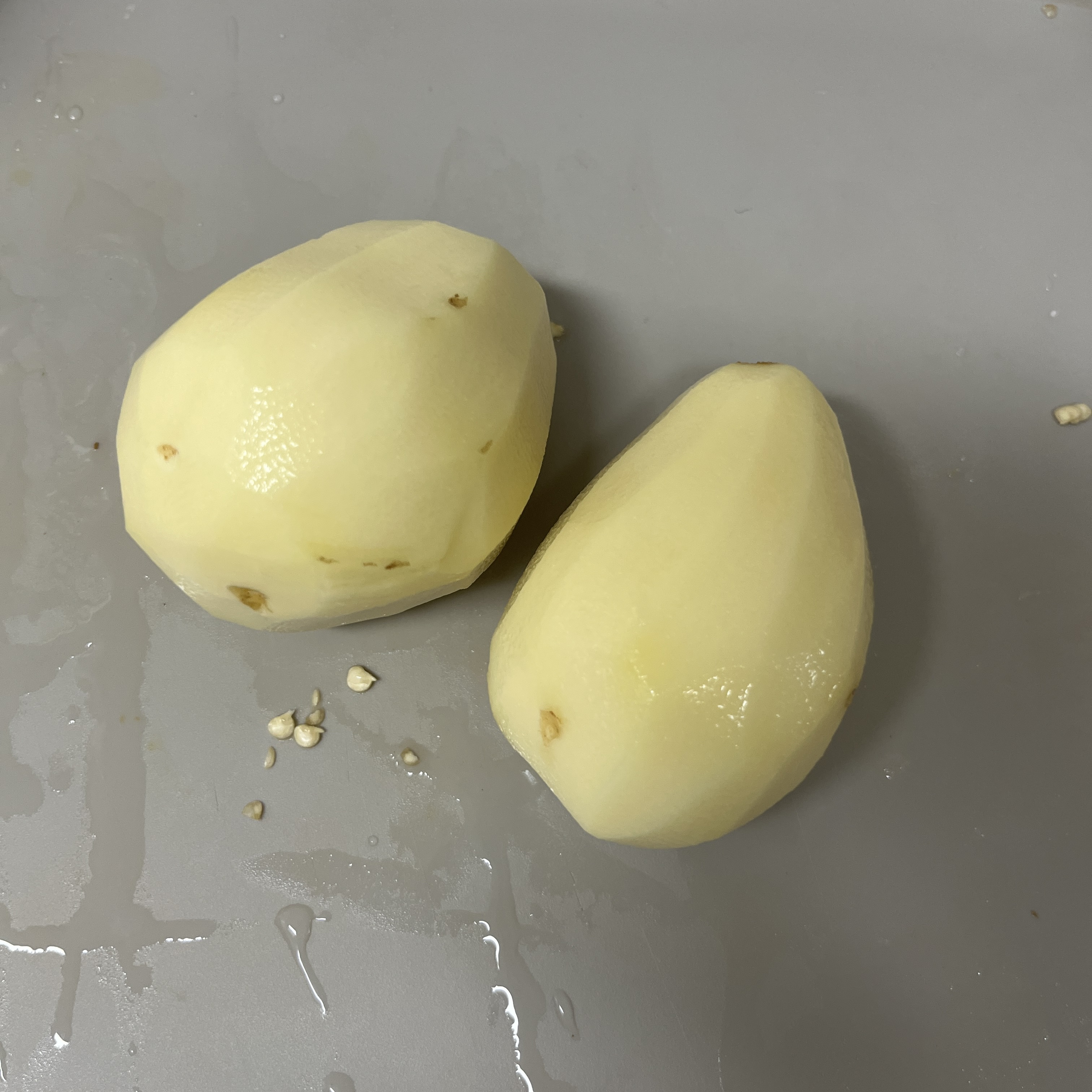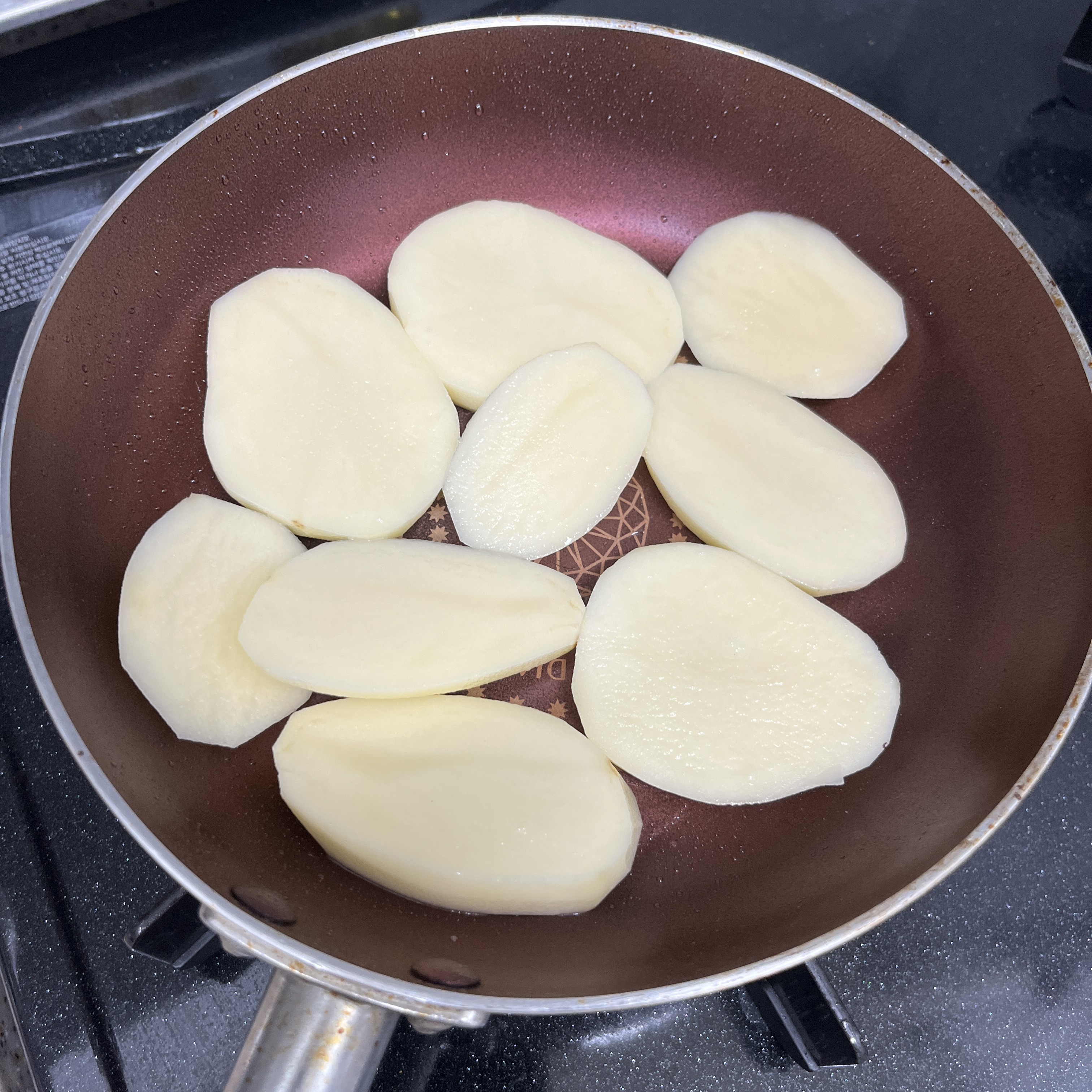 감자 2개를 잘 씻어서 껍질을 까고 적당한 두께로 잘라서 팬에 올립니다.