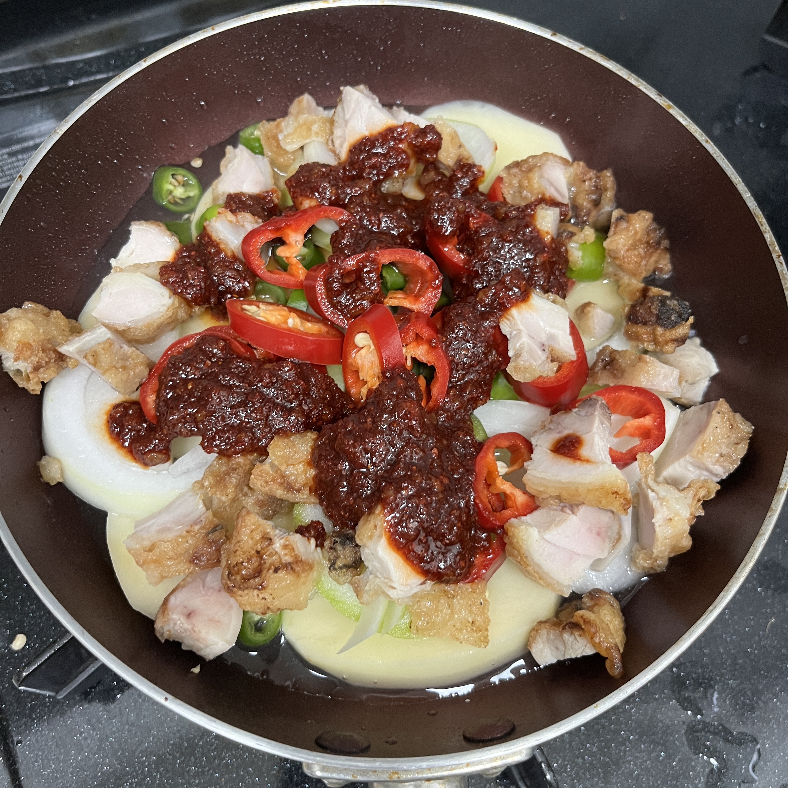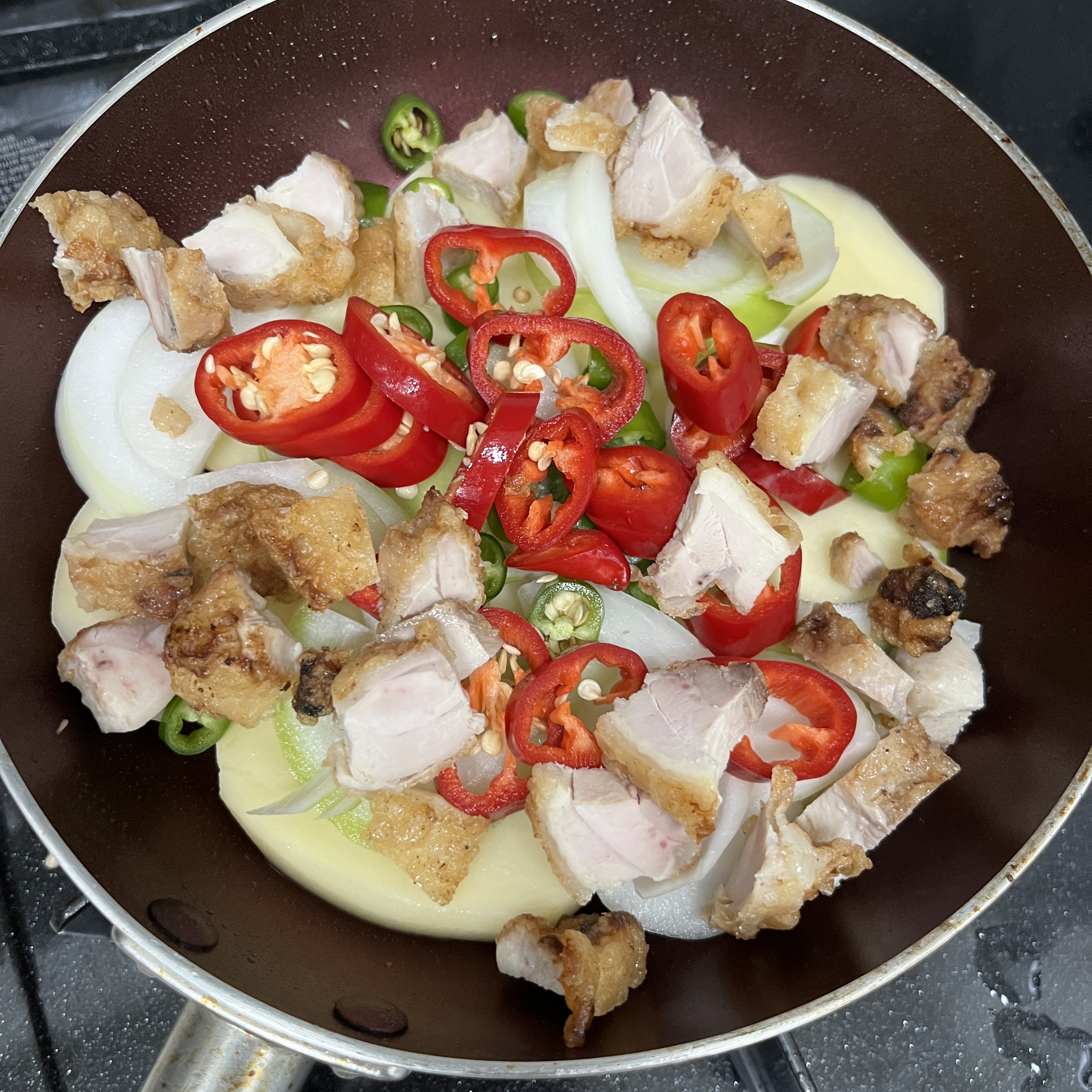 양파, 청양고추, 홍고추를 썰어서 넣고 저는 냉장고에 유린기 만들고 남은 닭다리살 튀김조각이 있어서