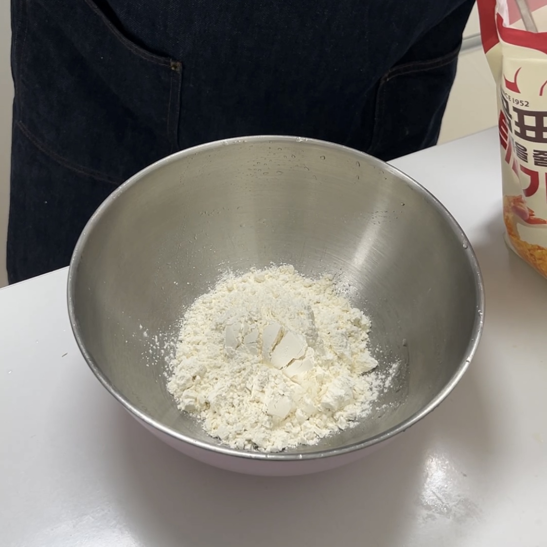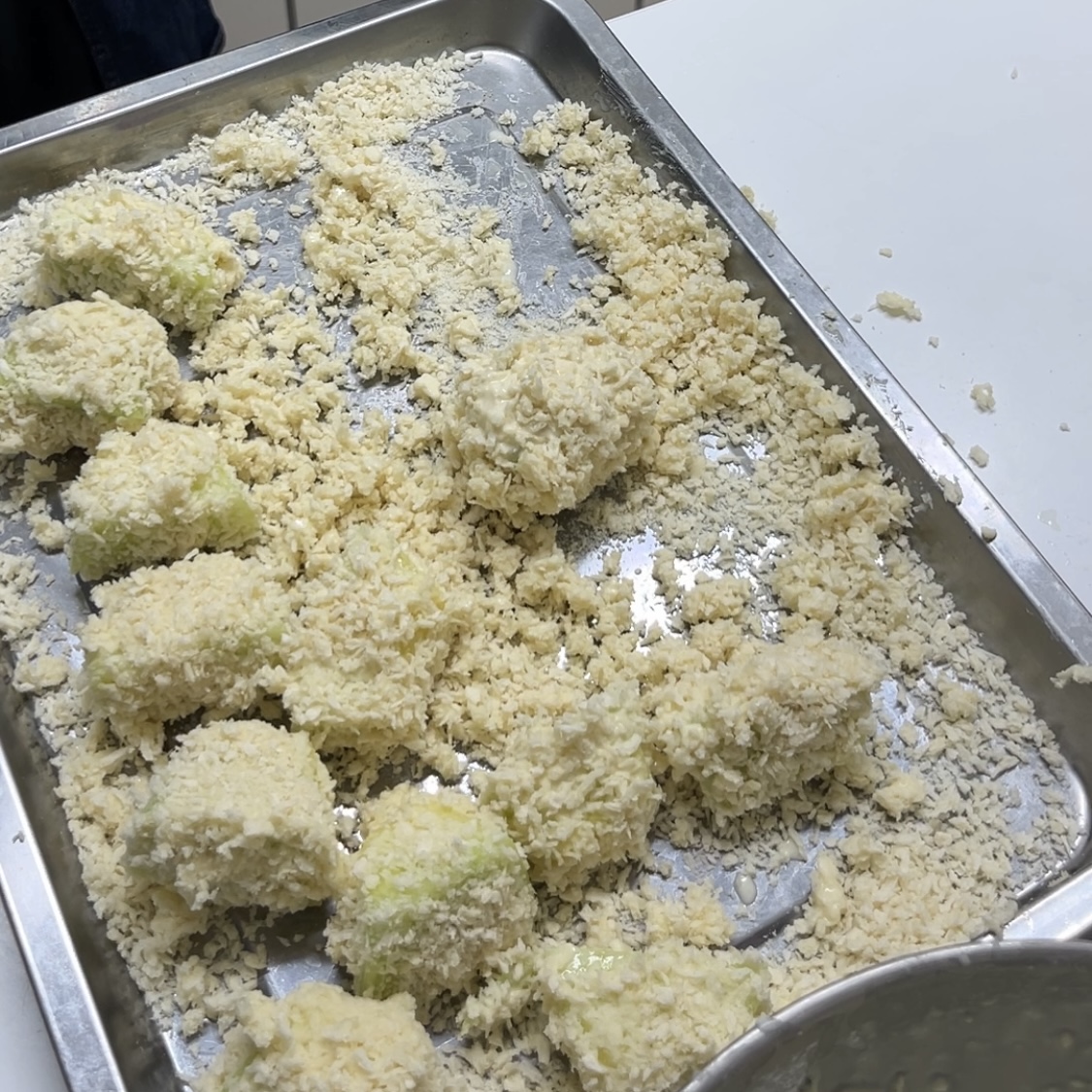 빵가루를 넓은 트레이에 부어 넓게 펴줍니다.